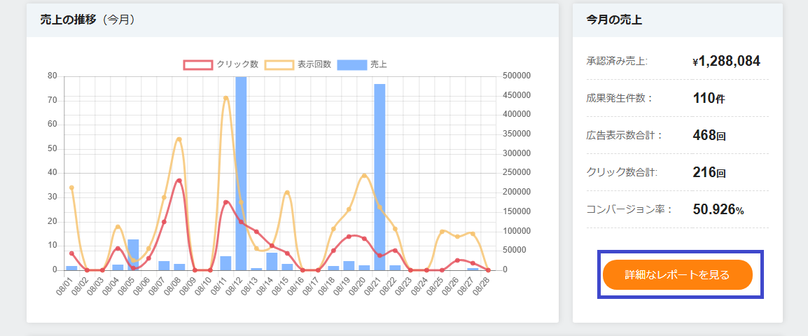 ユーザー管理画面のホームでは過去30日間の売上推移と、今月の売上がすぐに確認できます。さらに詳しいレポートを見たい場合は、「詳細なレポートを見る」ボタンをクリックしてください。