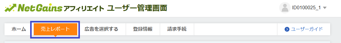 上記、STEP1の簡易レポートから「詳細なレポートを見る」のボタンをクリック、またはユーザー管理画面の上部メニューから「売上レポート」をクリックします。